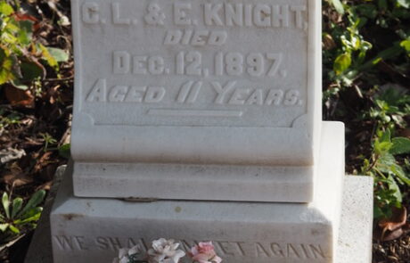 Elnora (Ellen Nora) Coats Knight (1864-1886) and her daughter, Edith Knight (1886-1897), are buried together in the Gualala Cemetery. While there are no records to corroborate, it is presumed that Elnora died during childbirth. Her daughter Edith died at the age of eleven due to unknown causes.